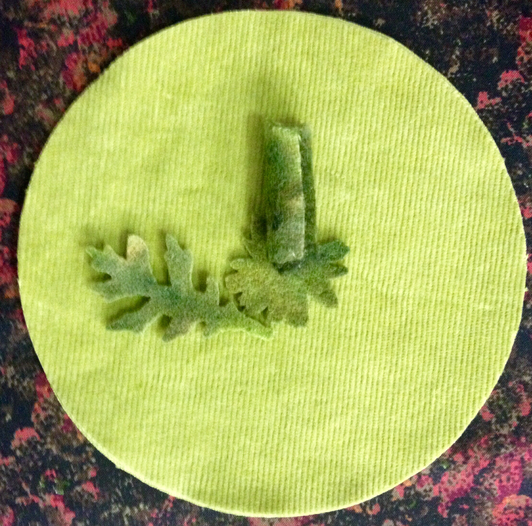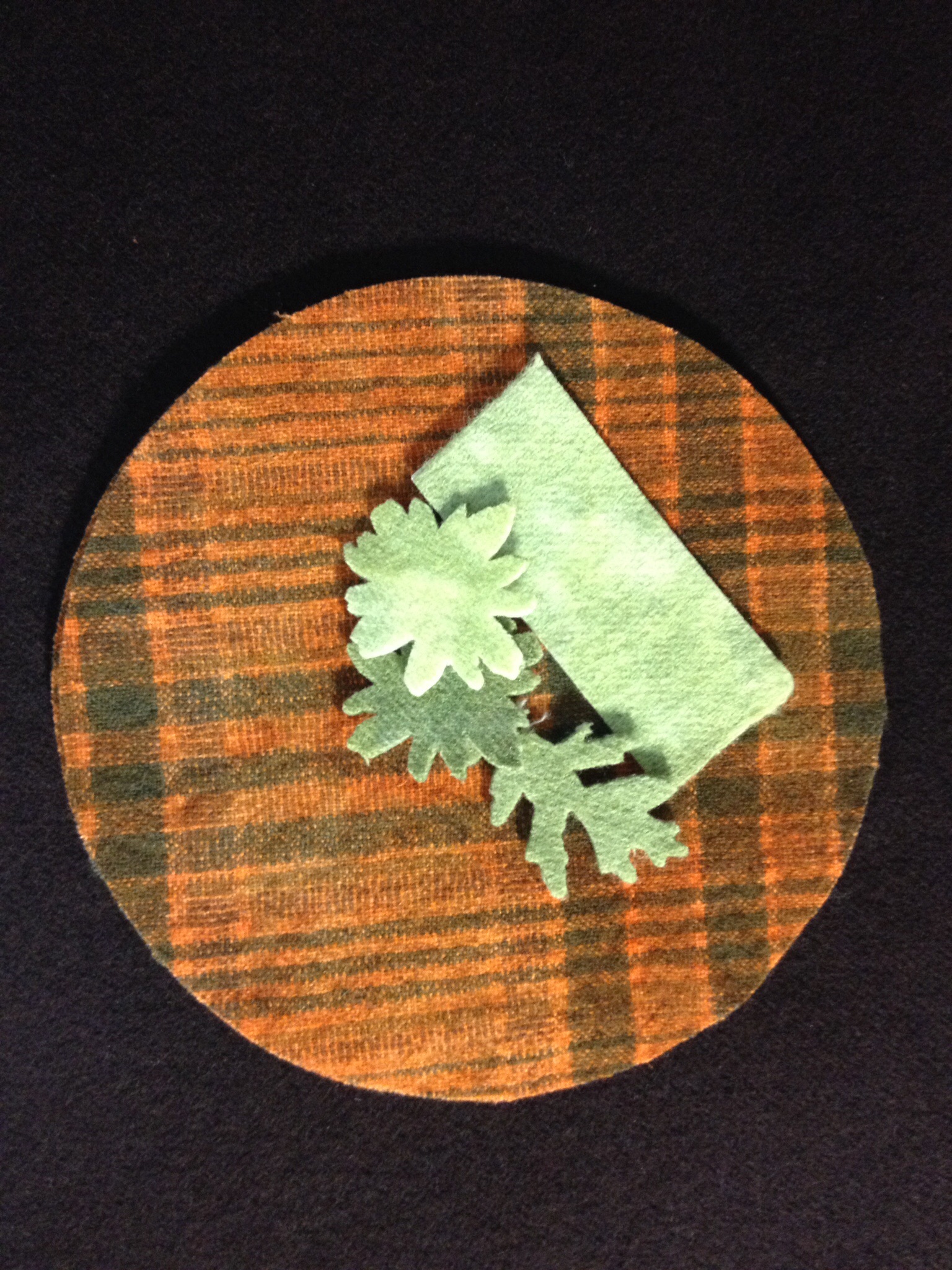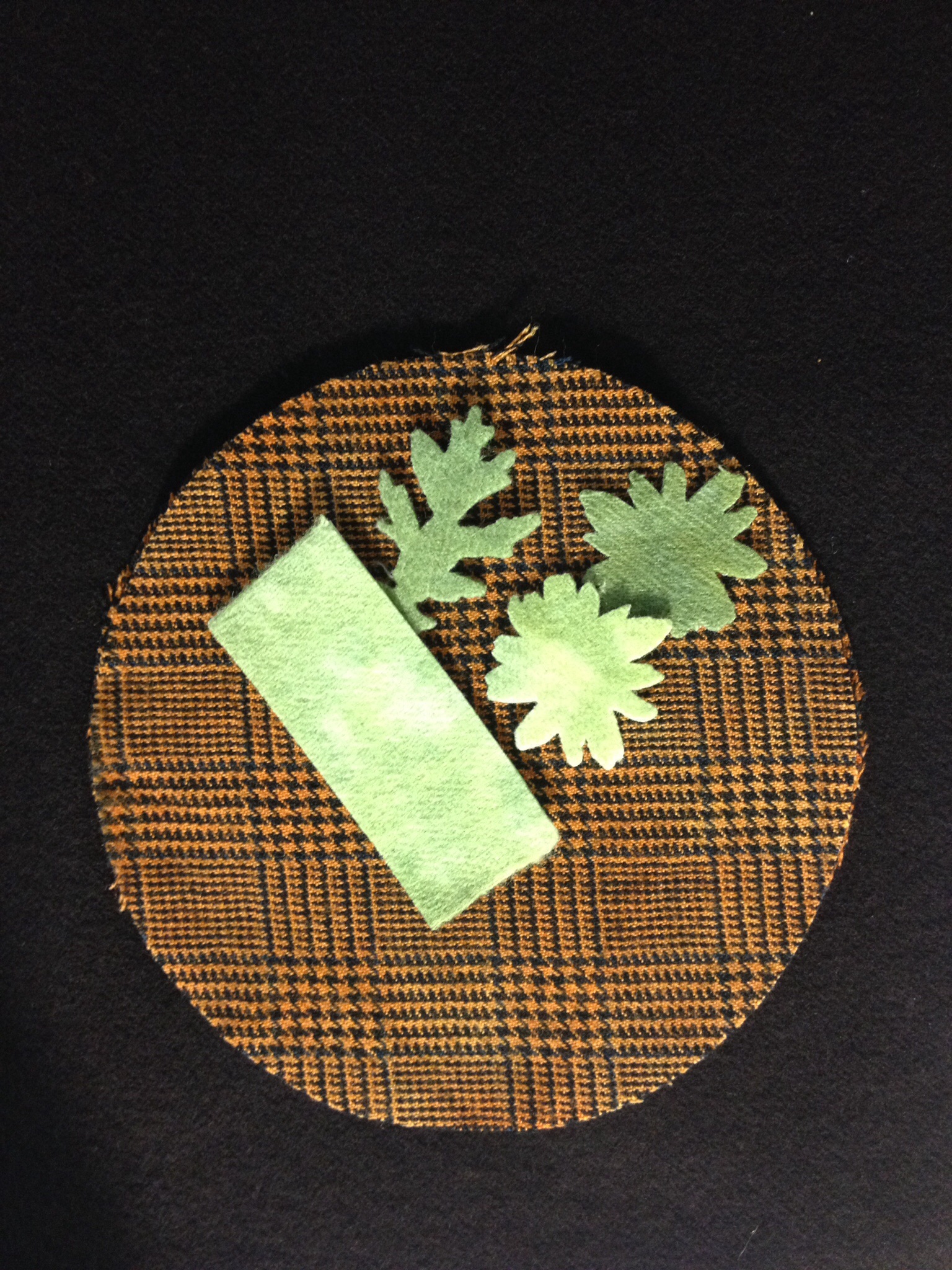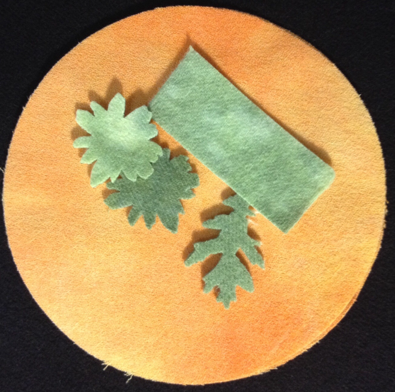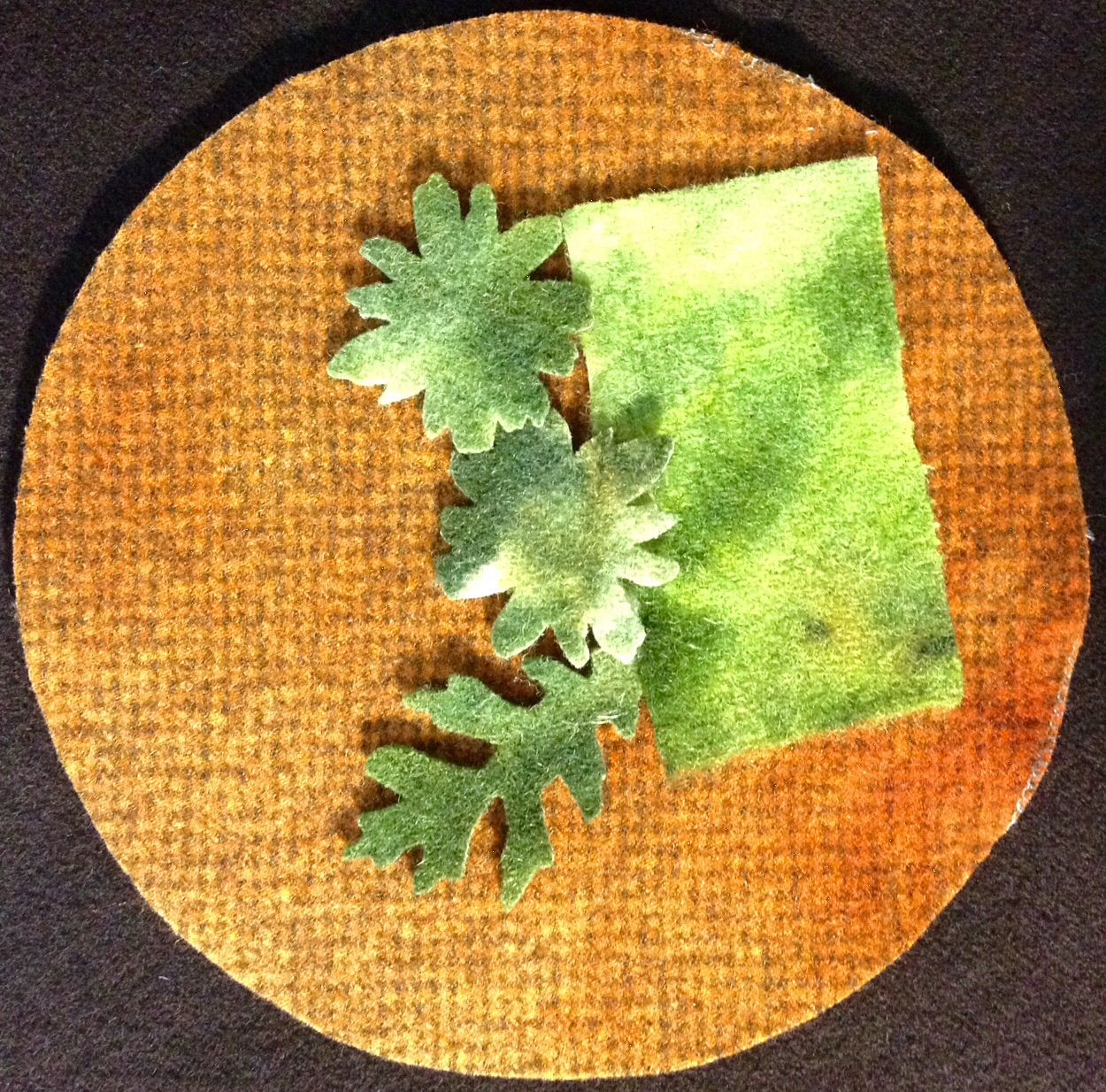 So, do you recycle? For several years now I have been addicted to working with felted wool in my quilting projects. Without a Local Quilt Shop close enough to provide the wool I want and need for my projects I have a considerable stash of recycled wool and the occasional other fabric when it is too awesome to pass up. That’s where this Pumpkin Cushion got its start. I couldn’t resist a skirt made of a beautiful irridescent green taffeta with a black velvet jacquard print. Unfortunately the photo doesn’t do this beautiful fabric justice. Die cut with my favorite Sizzix dies. I used the Big Shot Pro Die Cutting Machine, 6″ Circle Die, Tim Holtz Movers and Shapers Die Tattered Leaves, Medium Die Flower Layers w/ Leaf #2 and a 1″ x 3″ rectangle.