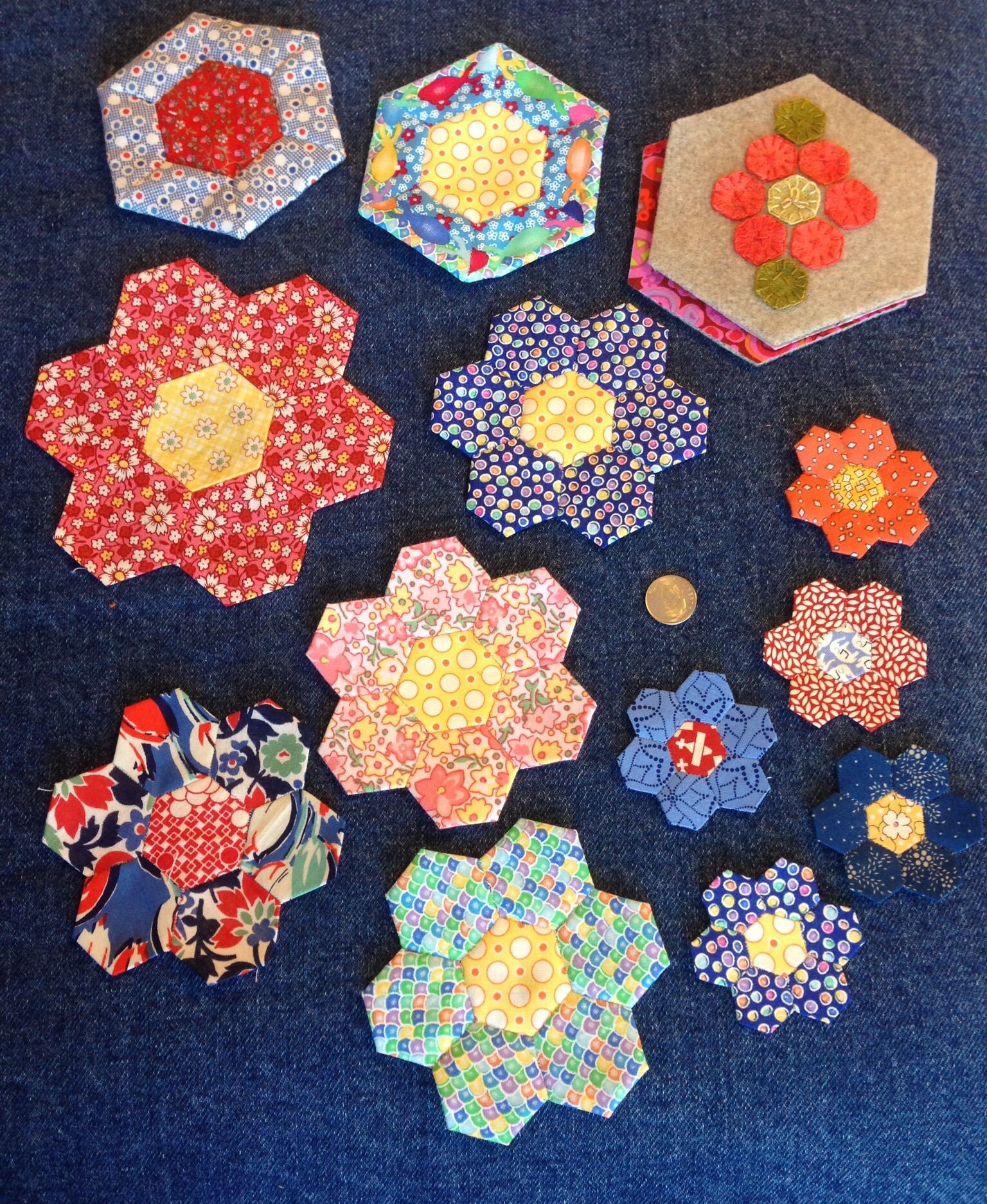 My gals went crazy! I was afraid I would get grumbling as this is a departure from our usual felted wool appliqué. They surprised me by loving the tiniest hexie the best. Check out those fussy cut centers. These are just the ones I managed to photo.