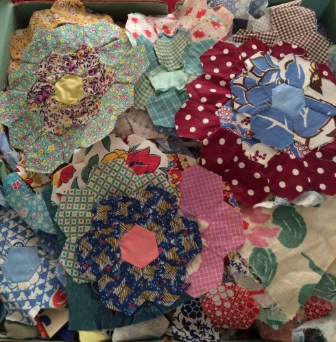 If you have inherited or purchased some vintage or antique hexagons you are well aware of the pitfalls of this time honored technique. Every 1/32″ error in cutting or stitching compounds. You can see from the box how wonky they already were at this early stage in construction. There is just not much to be done to get these lovelies to lay flat.