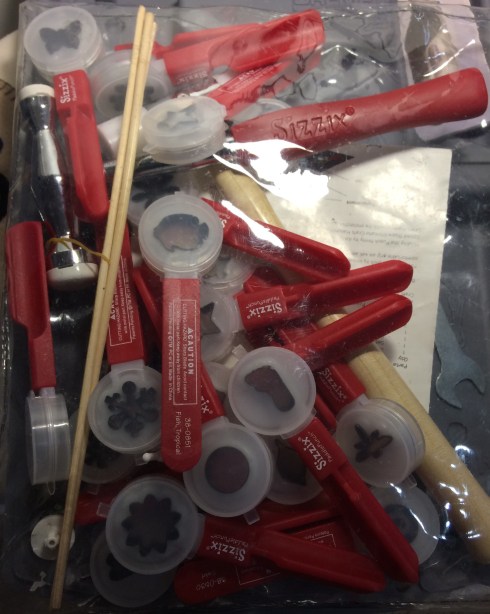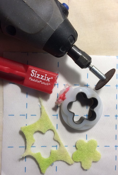 Movers and Shapers dies. Turns out they are the same height. I used my Dremel Tool to cut the die end from its handle and they are perfect. FYI the height of the handle is too high to operate as is in the Movers and Shapers Tray thus the need to cut the die away from the handle. They are not magnetic but that doesn’t bother me as I usually just snug what I am cutting into the tray corner anyway. I’ll get hubby to cut the rest as I am sure he will be neater.The Paddle Punch steel rule dies by Sizzix are retired but readily available on line at various resale venues.