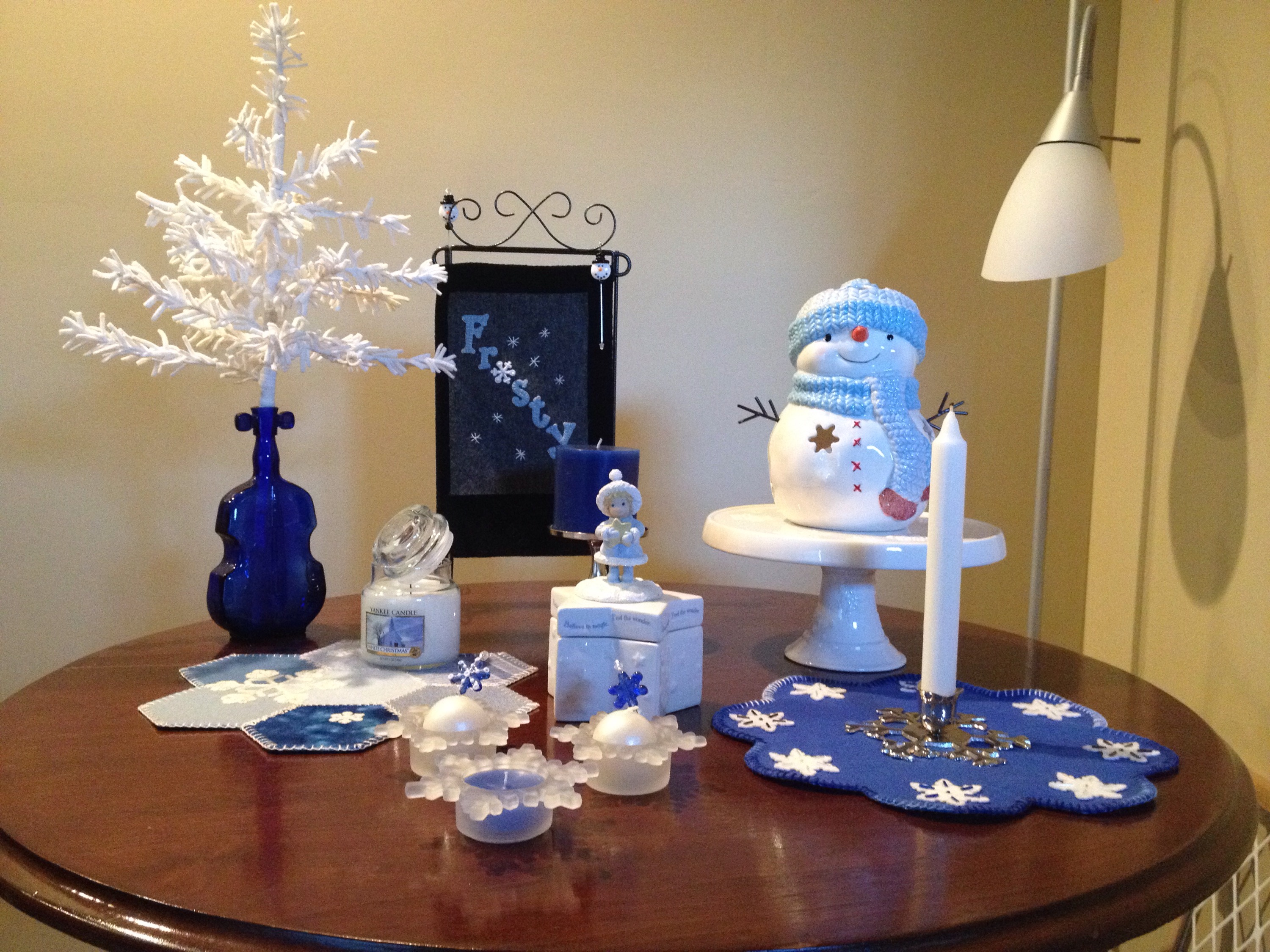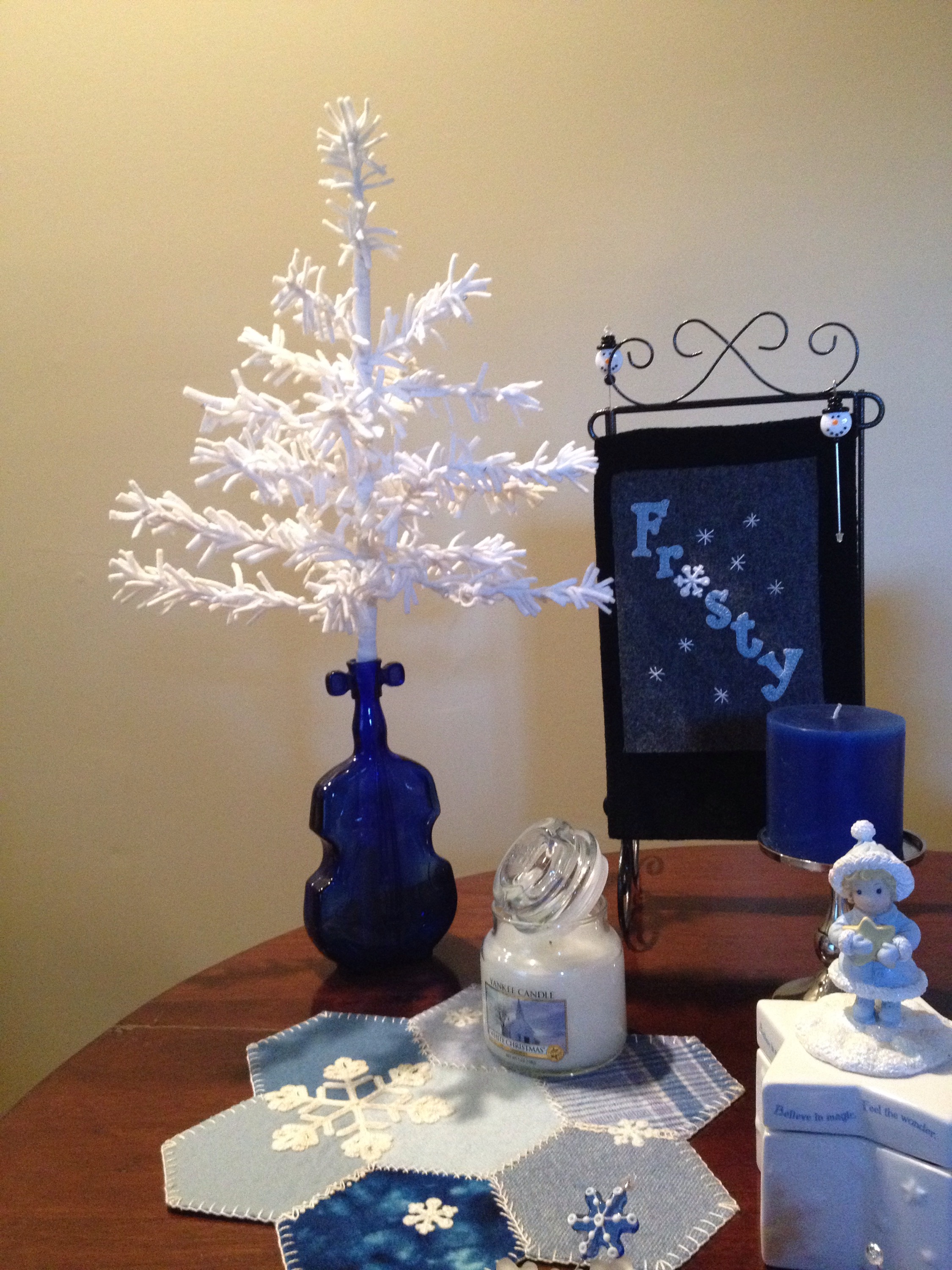 Hopefully you survived last week’s threatened snowmagedon! Here is a photo of my Frosty Fun table scape made with felted wool die cuts from Sizzix steel rule dies. Time to put the snowflakes away and decorate for Valentines.