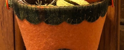 So, do you recycle?  For several years now I have been addicted to working with felted wool in my quilting projects.  Without a Local Quilt Shop close enough to provide the wool I want and need for my projects I have a considerable stash of recycled wool and the occasional other fabric when it is too awesome to pass up.  That’s where this Pumpkin Cushion got its start.  I couldn’t resist a skirt made of a beautiful irridescent green taffeta with a black velvet jacquard print.  Unfortunately the photo doesn’t do this beautiful fabric justice.  Die cut with my favorite Sizzix dies.  I used the Big Shot Pro Die Cutting Machine, 6″ Circle Die, Tim Holtz Movers and Shapers Die Tattered Leaves, Medium Die Flower Layers w/ Leaf #2 and a 1″ x 3″ rectangle.